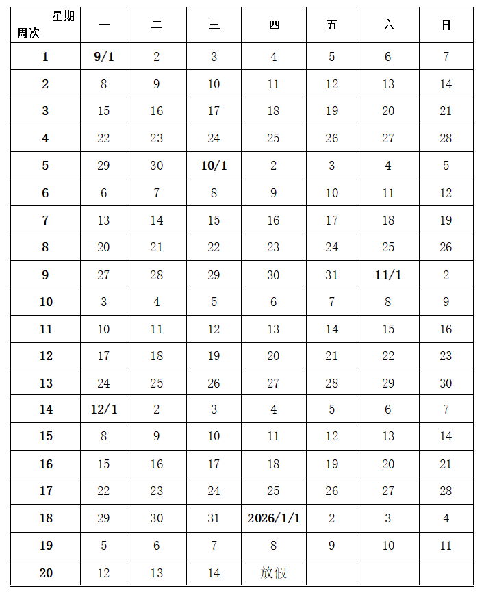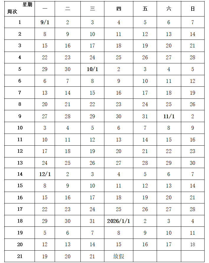 一、第一学期:全市义务教育学校统一于2025年9月1日开学,2026年1月14日结束。寒假从2026年1月15日开始,3月1日结束。 全市普通高中统一于2025年9月1日开学,2026年1月21日结束。寒假从2026年1月22日开始,3月1日结束。 二、第二学期:全市义务教育学校统一于2026年3月2日开学,7月14日结束。暑假从2026年7月15日开始,8月31日结束。 全市普通高中统一于2026年3月2日开学,7月21日结束。暑假从2026年7月22日开始,8月31日结束。 三、按照《义务教育课程方案和课程标准(2022年版)》要求,2025-2026学年度共39周。一至八年级新授课时间35周,复习考试时间2周,学校机动时间2周;九年级新授课时间33周,第一学期复习考试时间1周,第二学期毕业复习考试时间3周,学校机动时间2周。学校机动时间可用于集中安排劳动、科技文体活动等。 按照《普通高中课程方案(2017年版2020年修订)》要求,每学年52周,其中教学时间40周,社会实践1周,假期(包括寒暑假、节假日和农忙假)11周。 四、学期中,国家法定节假日放假时间按照国家有关规定执行。 无限动漫 义务教育学校2025—2026学年度 第一学期校历