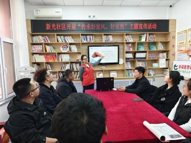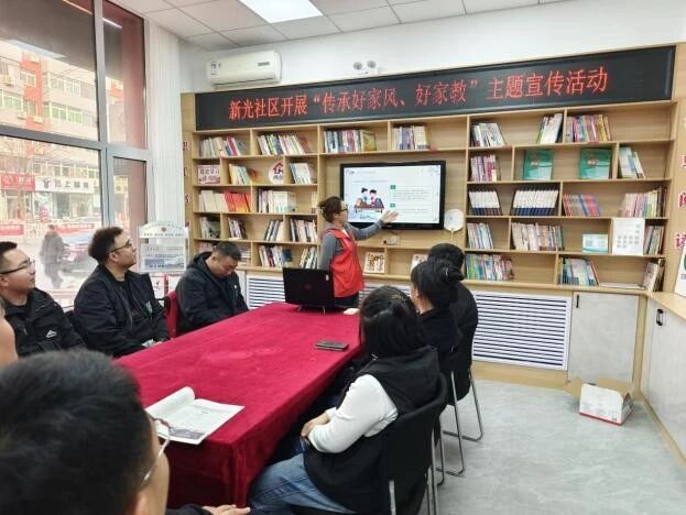 社区志愿者教师人员先从经典入手,展示宣传家风PPT,结合《颜氏家训》《朱子家训》中的传世智慧,用“岳母刺字”“孔融让梨”等家喻户晓的历史典故,清晰阐释“什么是家风”“家风为何重要”,为大家分享社区模范家庭每日生活的真实故事,让居民真切感受到“优良家风从不是遥不可及的大道理,而是藏在日常点滴里的小坚持。” 在互动环节,现场居民纷纷发表自己对传承好家风的看法,并用自己家庭生活经历举例,“我们家一直教孩子’做人要诚信,做事要踏实’,十分注意自己家庭的言传身教,保证孩子以后树立良好正确的三观。”在看到有居民代表发言后,现场居民们纷纷打开话匣子,有人分享“勤俭节约”的家训传承,有人讲述“邻里互助”的家风,现场气氛融洽。